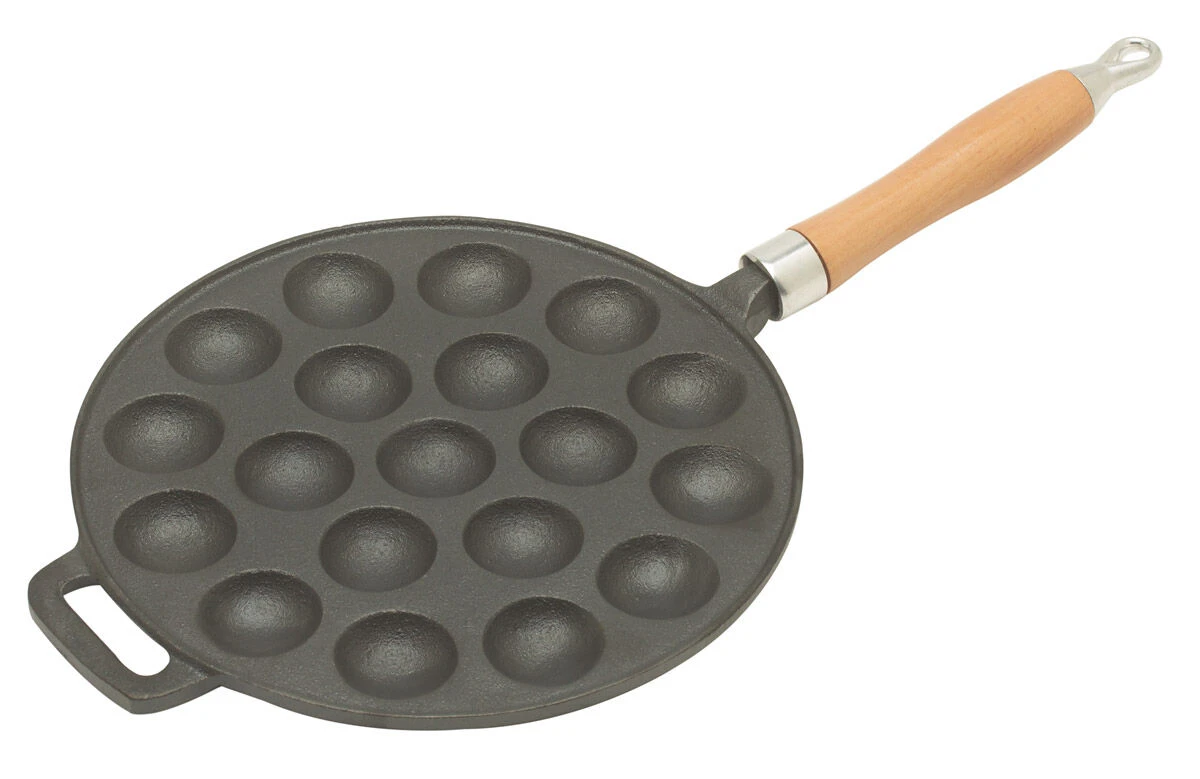 De Oldenhof poffertjespan is vervaardigd van gietijzer en heeft een diameter van 25 cm. Het gietijzer zorgt voor een zeer gelijkmatige verspreiding van de warmte door de pan. De houten steel en tegengreep zorgen voor extra draaggemak van de poffertjespan. Gebruik de ronde Oldenhof poffertjesplaat voor de bereiding van 19 poffertjes per keer.